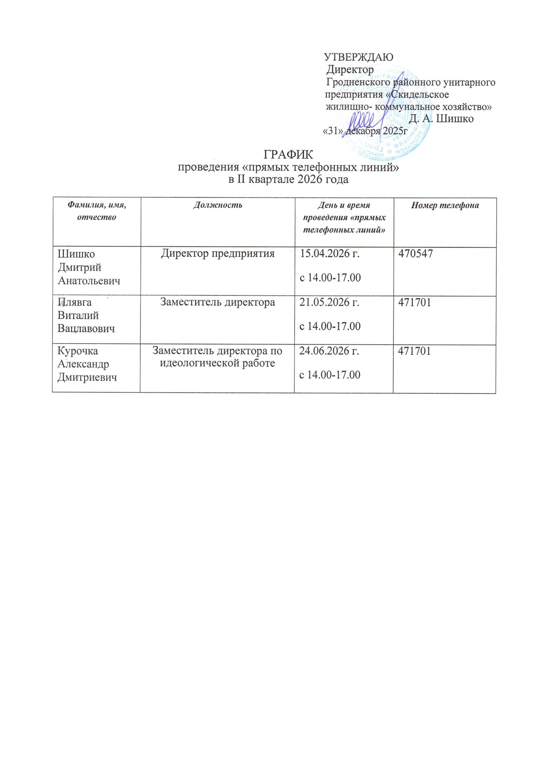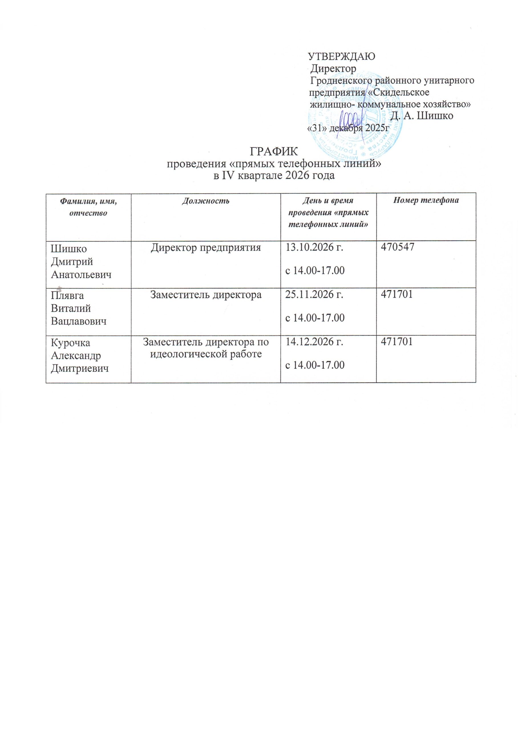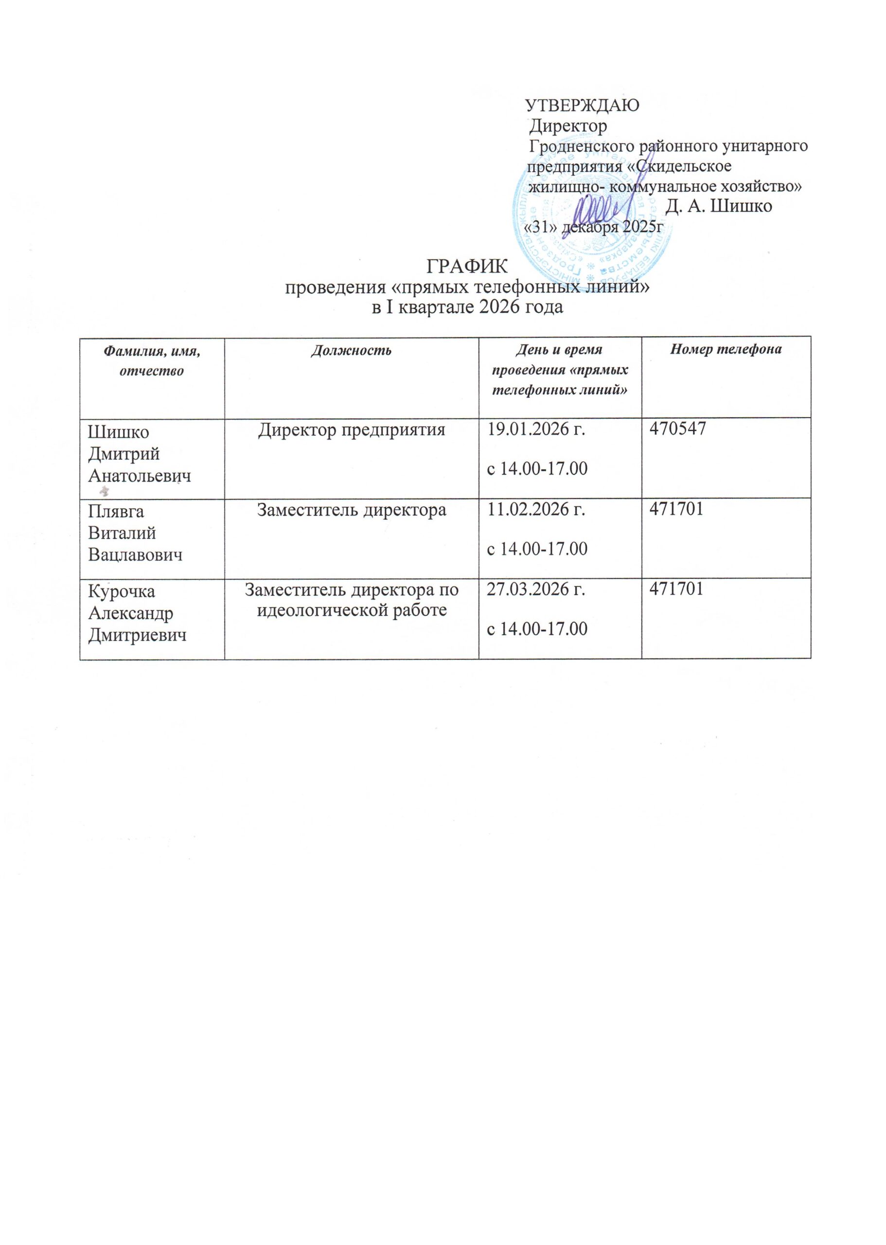 График личного приема граждан и юридических лиц руководящими работниками. Гродненское районное унитарное предприятие «Скидельское жилищно — коммунальное хозяйство»